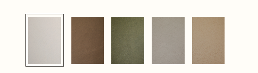 Für die Mikrozementprodukte bieten wir 5 verschiedene Oberflächen an: Gebrochenes Weiß, Erde, Olivgrün, Steingrau und Sand.